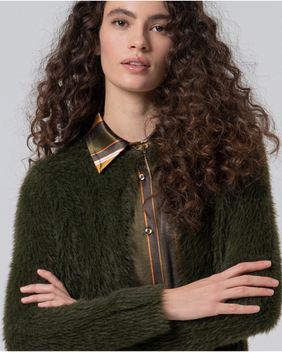 Veste courte à effet fourrure avec fermeture à crochet à l'encolure. Très douce au toucher, c'est un vêtement léger et enveloppant qui apporte une touche sophistiquée au look sans perdre en confort.