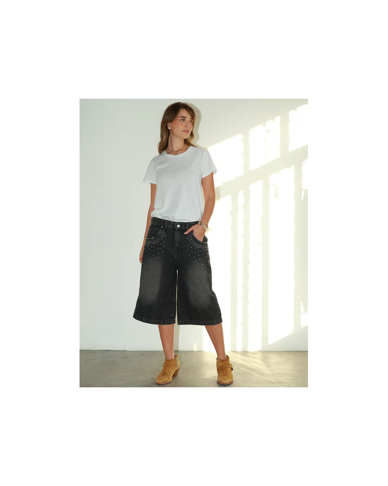 ME369 - Bermuda denim noir cristaux coupe large Indi