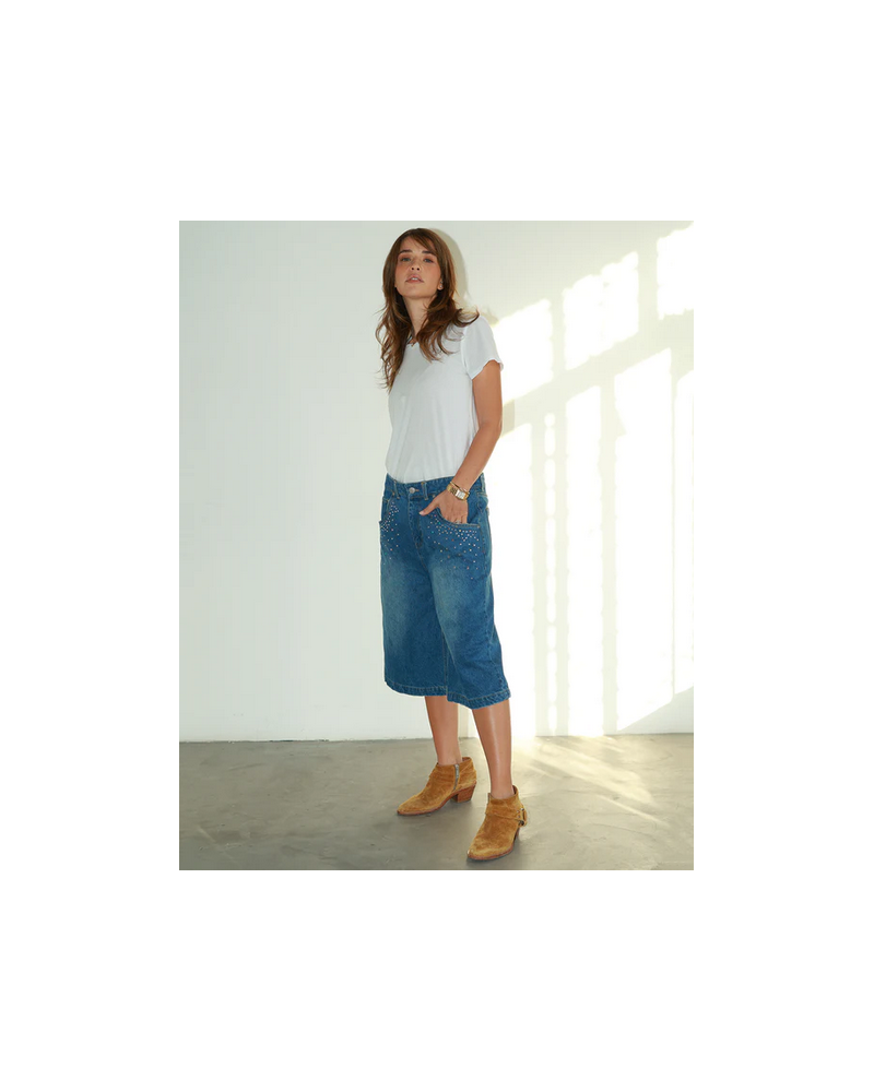 ME369 - Bermuda denim bleu cristaux coupe large Indi