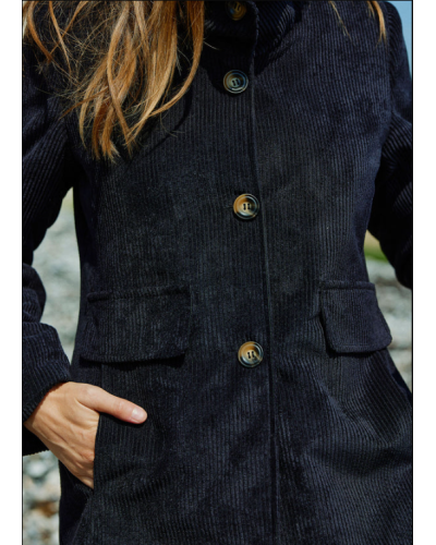 Veste en velours côtelé avec col montant fermée par des boutons style corne ainsi que des poches doublées sur les côtés.