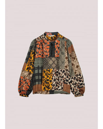 Haut fluide imprimé patchwork coloré, manches légèrement bouffantes, ourlet élastique, col montant et fente avec passepoil, fermé par un bouton en nacre.
